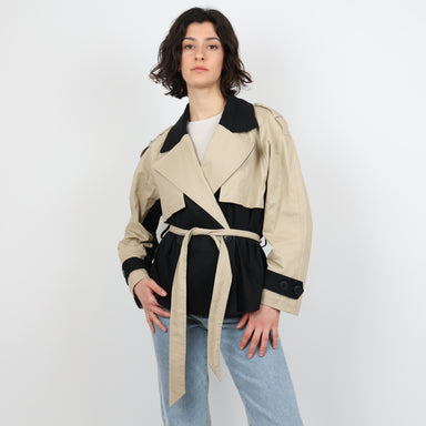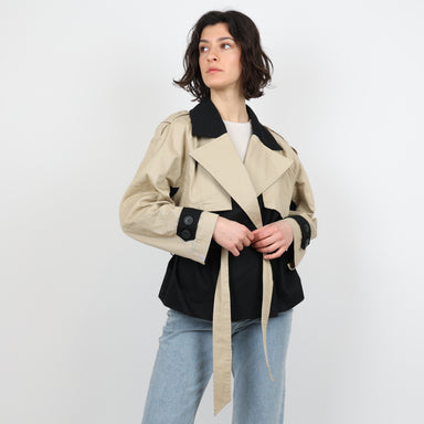 Original Price £495.00Current Price £185.00UK Size 10, 38 Maje Jacket, Excellent Condition. - Colour block short trench - Vent back - Black and camel colour -Belted waist - Double breasted b...